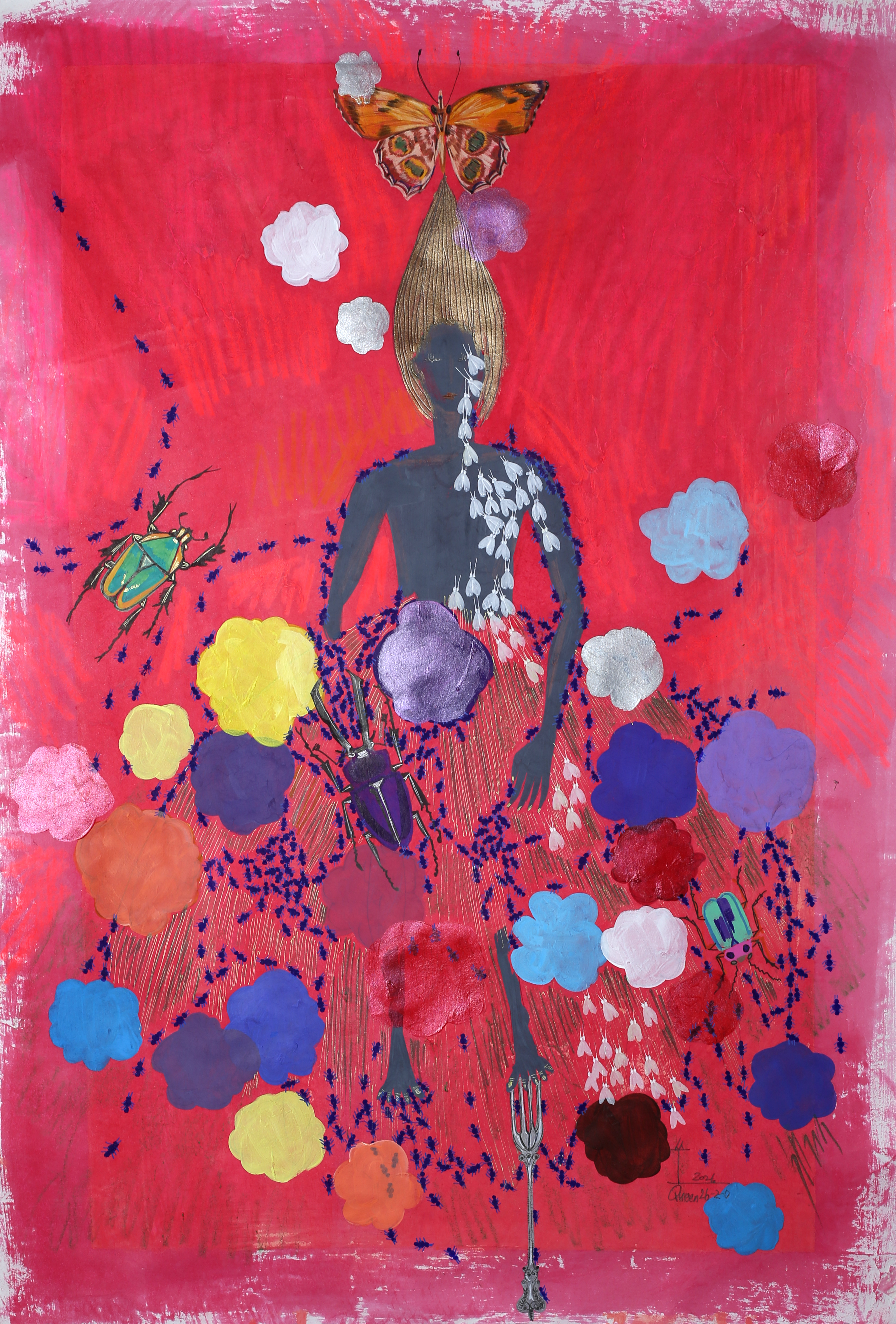 Kim Soo Young is a Korean-born artist whose practice has been shaped by over two decades of immersion in French artistic traditions. Moving fluidly between fine art and fashion, she has developed a visual language that defies easy categorization — rooted equally in personal memory and cross-cultural experience. Her work draws from travels across West Africa, life in Europe, and the cultural heritage of Korea, weaving these influences into large-scale figurative paintings executed in mixed media on hanji, Korean traditional paper. At the center of her practice stands the figure of the Queen — not as symbol of power, but as embodiment of endurance, femininity, and the silent authority of those who carry the weight of the world.